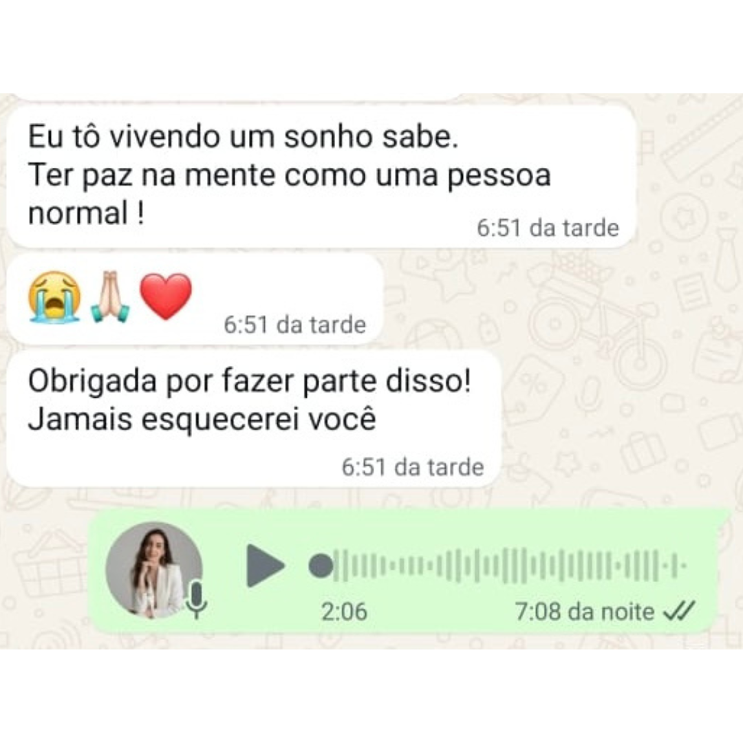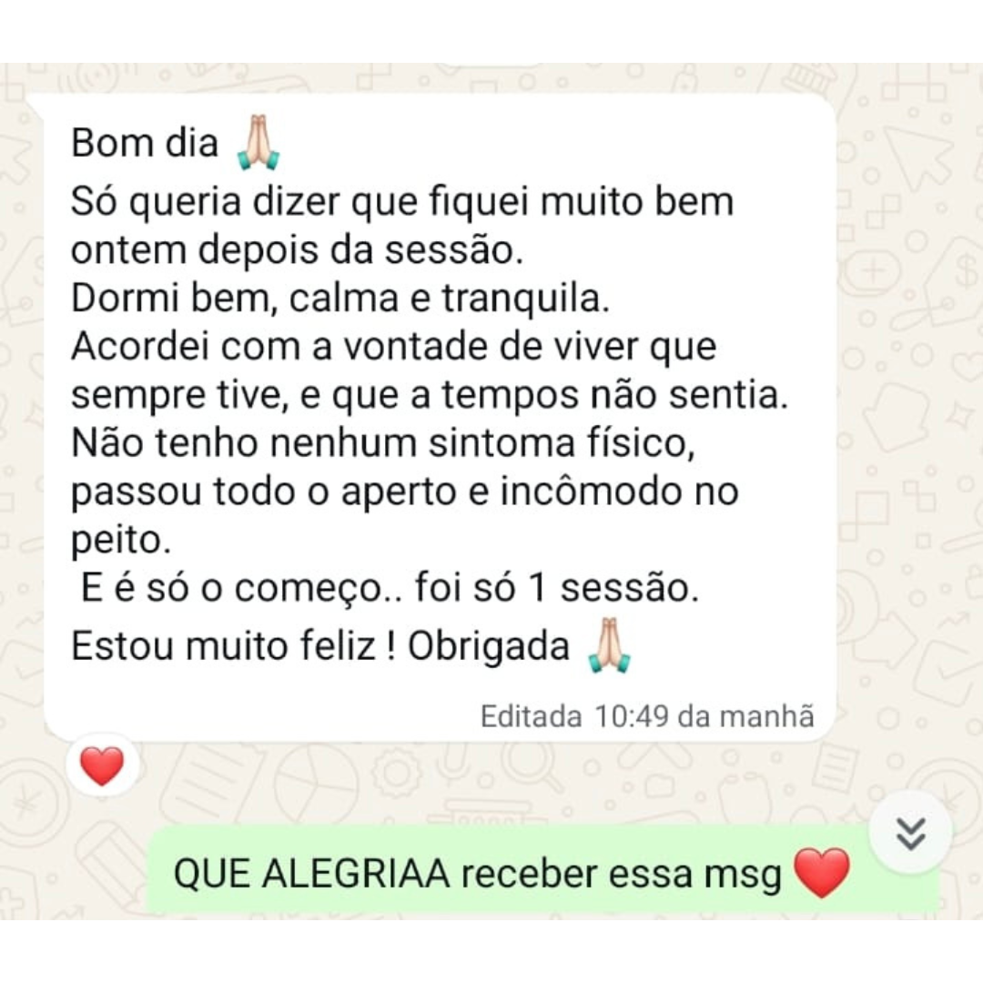 Você receberá um protocolo de Anamnese no seu whatsapp, que são perguntas específicas sobre seus sentimentos, pensamentos e sua história, para que eu possa fazer uma análise personalizada do seu caso, totalmente livre de julgamentos.